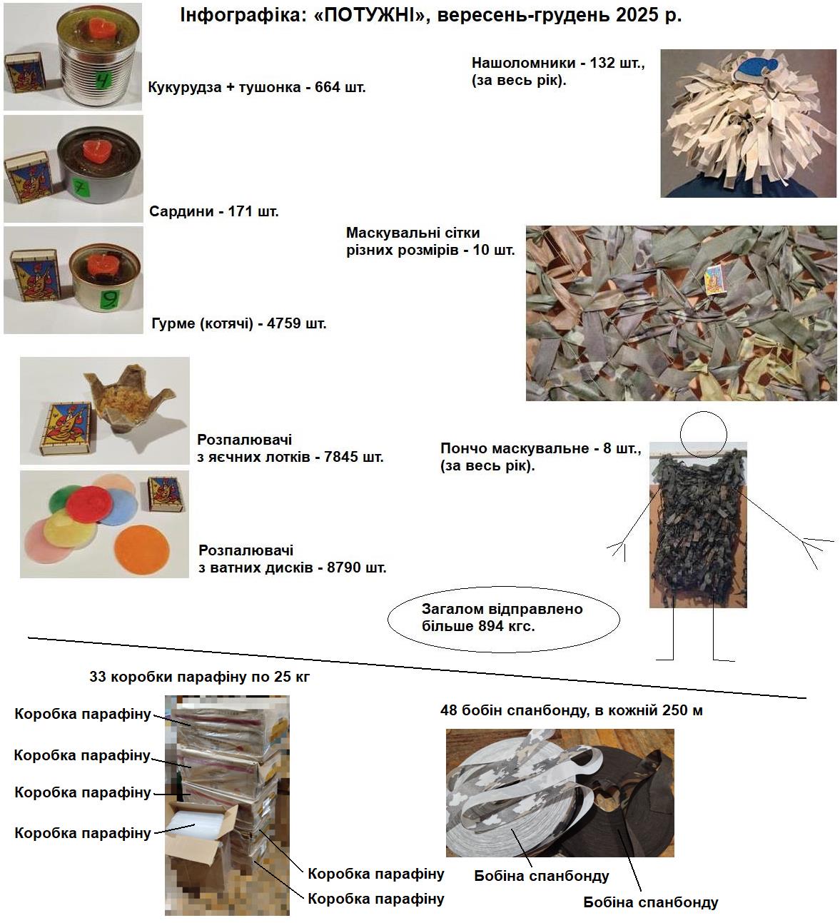 волонтерським рухом «Потужні» на «нуль» було відправлено: - Сіток розміром 3,5×6 м. - 5 шт. - Свічок: Гурме - 1355 шт.; Сардина, шпроти - 60 шт.; Кукурудза, тушонка, молоко - 94 шт. - Розпалювачі з ватних дисків - приблизно 750 шт. - Розпалювачів з яєчних лотків - приблизно 900 шт. - Нашоломників - 46 шт. До вересня 2025 р. було багато відправок, але вони, особливо якось не рахувались - не думали про це. |
